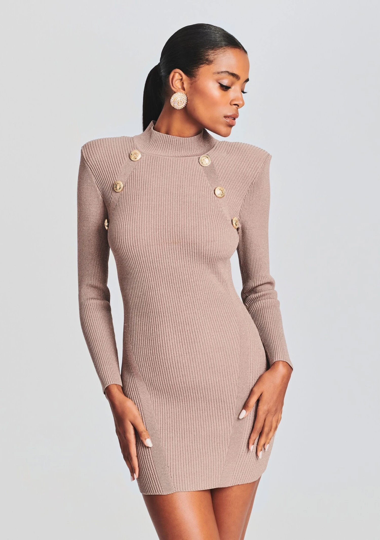Radiate style in our Aislinn Dress. This long sleeve knit dress features a mock neckline and shoulder pads. Carefully placed golden button arrangements make for the perfect final touch. Shown here in Metallic Satellite.