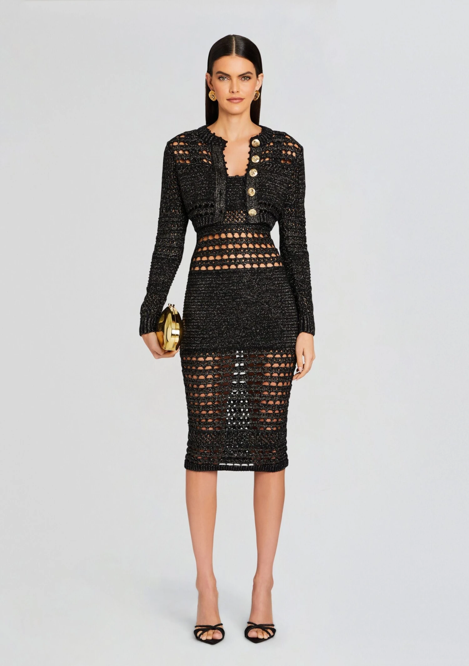 Indulge in the epitome of bohemian elegance with our Avril Crochet Dress. Crafted with meticulous detail, this mid-length stunner features intricate crocheted designs and cutout patterns that are your ticket to embodying effortless grace on any occasion. Shown here in Black/Gold.
