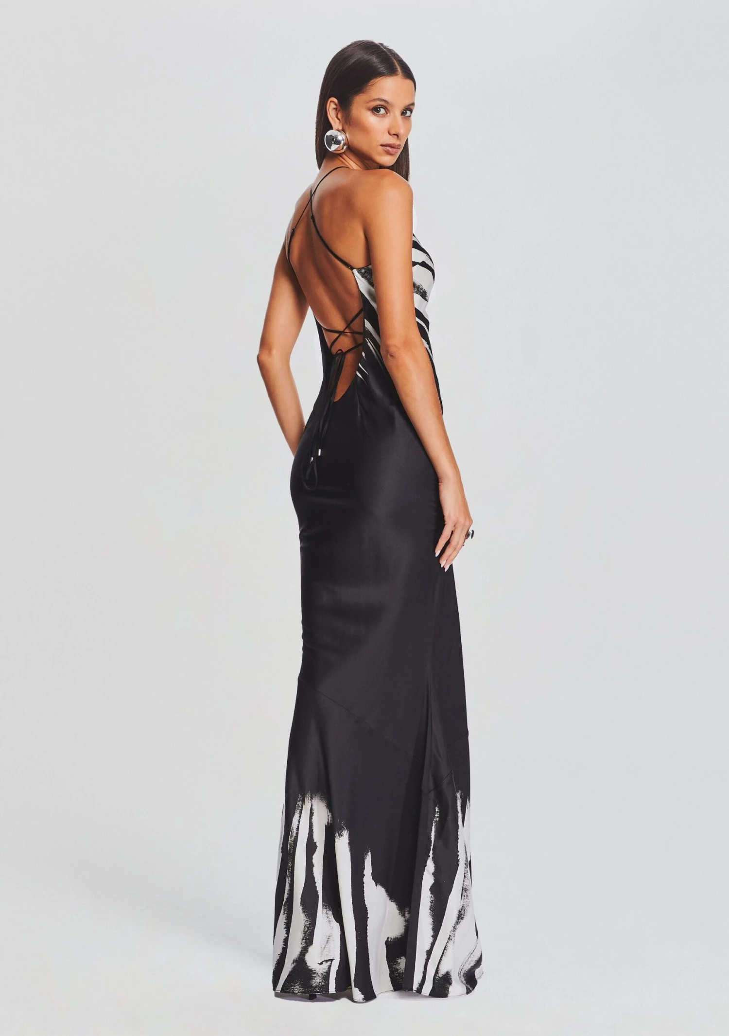Introducing our exquisite Cami Dress. The flowing silhouette and the timeless pattern of this dress make it a versatile choice, ideal for both intimate gatherings and extravagant soirées. This gown features a flattering scoop neck, adding to its allure and making it a statement piece for any occasion. Shown here in Zebra Ink Ombre.