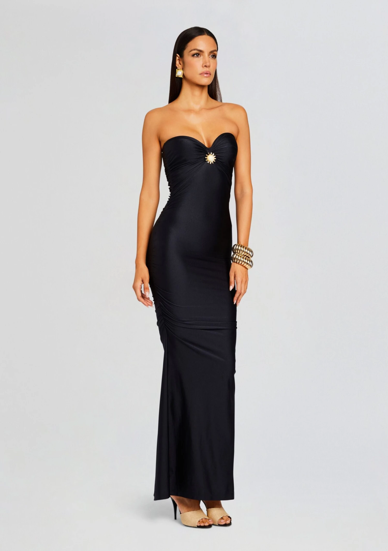 Unveiling Shani Shemer’s Maura Dress. Indulge in the ultimate blend of sophistication and glamour—perfect for resort evenings or upscale occasions. The embellished center beautifully complements the timeless allure of the sweetheart neckline, while the tantalizing slit in the back adds an extra dash of allure and grace to your ensemble. From sunset cocktails to moonlit walks, this dress exudes effortless glamour and sophistication—making it an essential addition to your resort wardrobe. Shown here in Black.