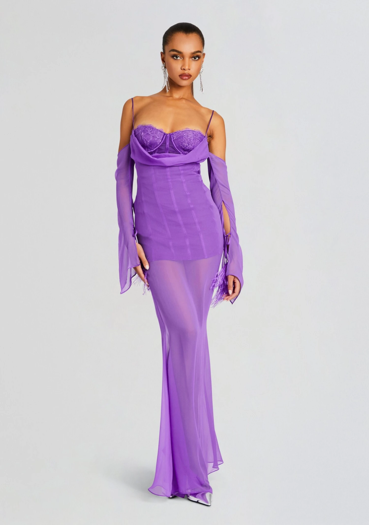 Designed to turn heads, our Meredith Dress will leave you the center of attention at any event. This captivating dress merges sophistication with playful details. This gown boasts a sheer layer over a fitted lining, creating a mesmerizing effect that embodies sheer sophistication and allure. The off-the-shoulder design adds a touch of glamour and allure, accentuating your neckline with an elegant cowl neck that drapes gracefully. The bustier corset top offers a structured yet flattering fit, enhancing your figure with a hint of sensuality and sophistication. The gown features charming dangling pom poms on the hand, adding a playful and whimsical touch to your ensemble. These delicate details capture attention, offering a unique and stylish twist to this sophisticated gown. Shown here in Amethyst.